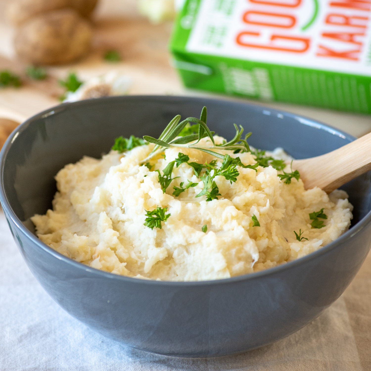 Who can resist a velvety, savory mash during the holidays? With Good Karma Unsweetened Oatmilk or Flaxmilk, you can lighten up this must-have side while enhancing flavor and nutrients! Paired with fiber-rich potatoes, savory roasted garlic and rosemary, creamy cauliflower cuts back on starchiness while adding even more fiber, plus vitamins C and K to this easy, deliciously dairy-free dish. Recipe by: Wendy McMillan