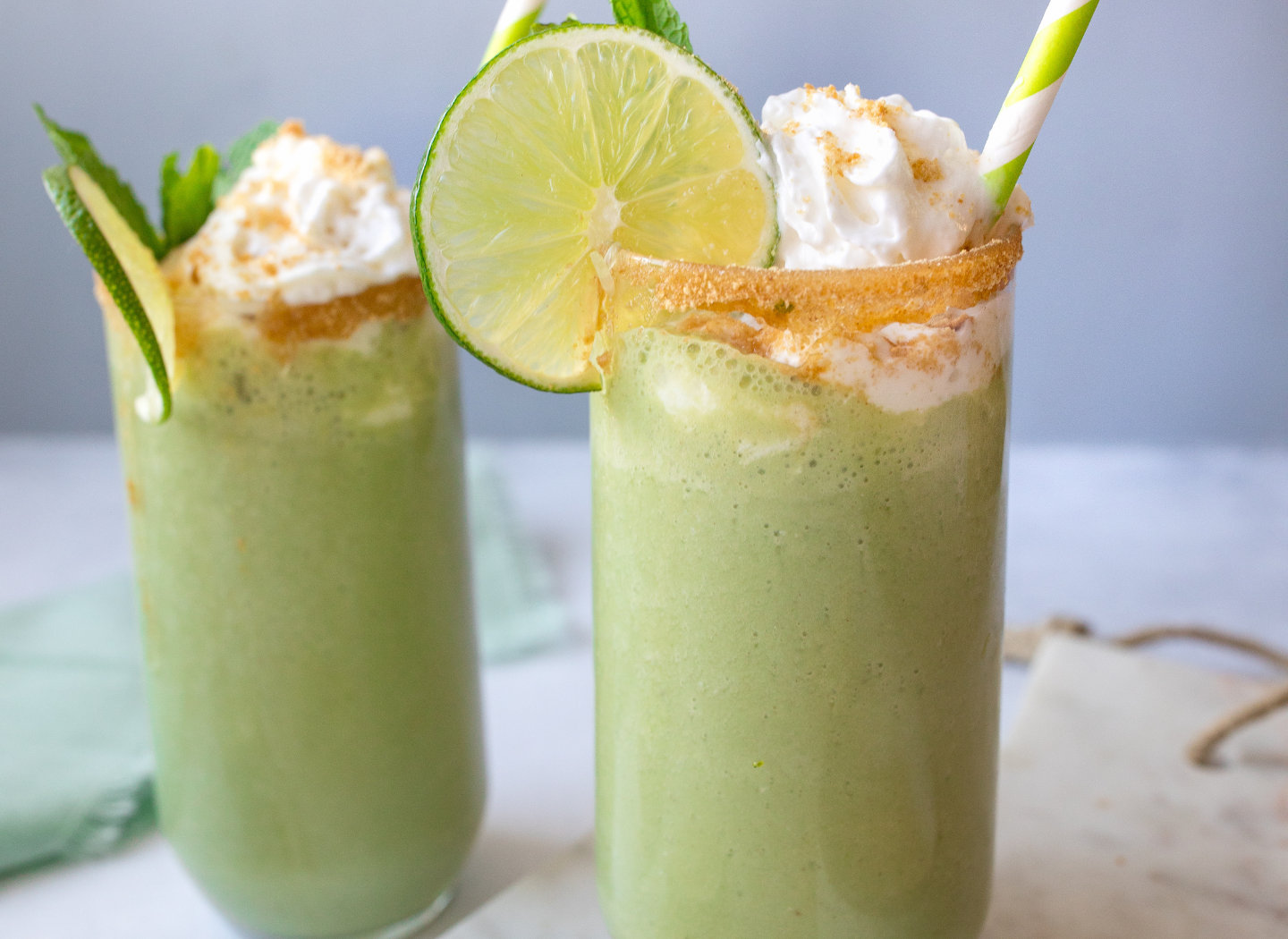 Divide smoothie into two glasses, top with whipped cream, lime wedges, mint leaves, and sprinkle with graham cracker crumbs. ENJOY!