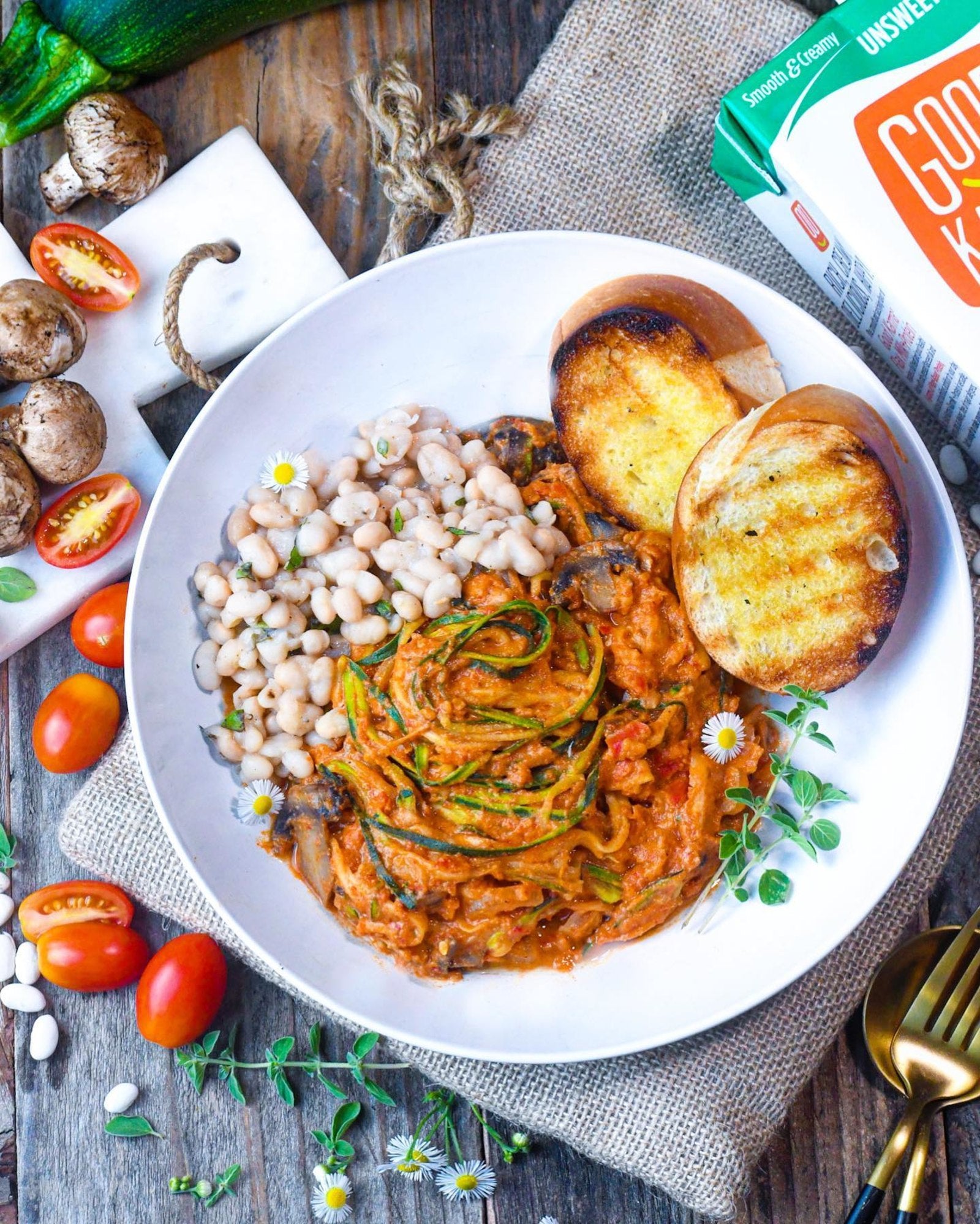 Dinner is served! If you're a pastaholic get ready for an upgrade with this Low Carb Zoodle in a Creamy Sun-Dried Tomato Sauce made by Lauren at @chickpea_and_herb. It's LOADED with veggies, easy to make and ready in 30 minutes, and mind-blowingly delicious! Plus, it has a splash of our creamy Unsweetened Flaxmilk + Protein for an added boost of delicious nutrition.