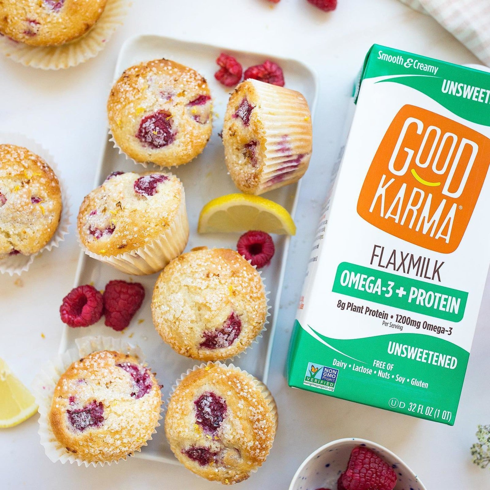 Preheat the oven to 350 degrees. In a large mixing bowl combine dry ingredients: flour, sugar, baking powder, salt and corn starch. Whisk until combined. In a separate medium bowl add Good Karma Unsweetened Flaxmilk + Protein and apple cider vinegar creating vegan “buttermilk”, set aside for 5 min. Next add oil, lemon zest, lemon and vanilla extr